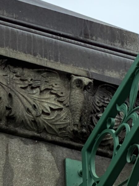 While not as common as doves (on the graves of children) or eagles (sometimes found on soldiers’ monuments), the owl was an appropriate motif for a cemetery gate as the nocturnal bird not only symbolizes wisdom, but a guardian and protector of the departed in several ancient cultures, including Celtic and Egyptian.